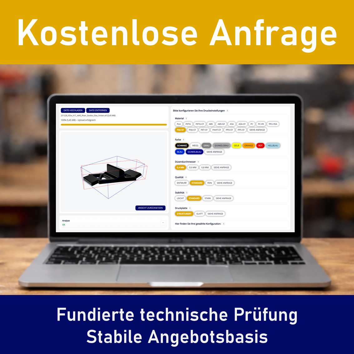 Mit dem Hochladen der Datei bestätigen Sie, dass Sie über die erforderlichen Rechte verfügen und dass die Datei automatisiert analysiert werden darf. Geometrische Werte werden als Millimeter (mm) interpretiert. Die ermittelten Bauteilabmessungen sind vor der Bestellung zu prüfen.